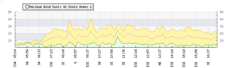 In the last few minutes the wind was Easterly at an average speed of 15 knots, reaching up to 28 knots and a low of 2 knots. The gust strength is26 knots above the minimum speed |