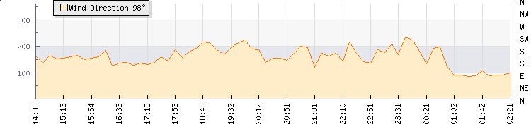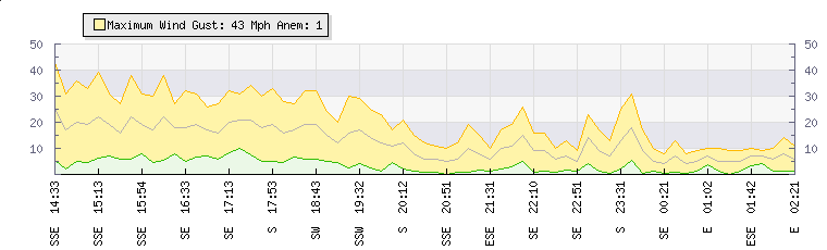 In the last few minutes the wind was East South East at an average speed of 5 mph, reaching up to 9 mph and a low of 1 mph. The gust strength is8 mph above the minimum speed |
