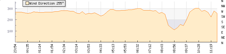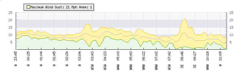 In the last few minutes the wind was South South East at an average speed of 8 mph, reaching up to 15 mph and a low of 1 mph. The gust strength is14 mph above the minimum speed |