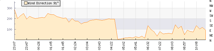 In the last few minutes the wind was East North East at an average speed of 15 mph, reaching up to 25 mph and a low of 4 mph. The gust strength is21 mph above the minimum speed |