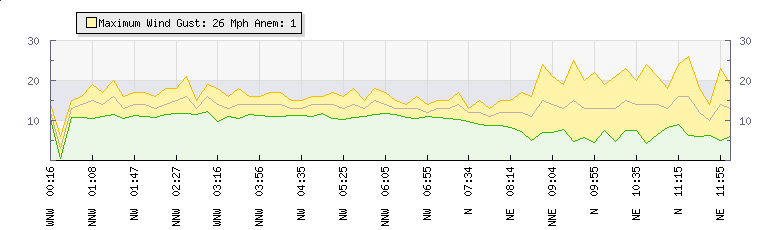 In the last few minutes the wind was North Westerly at an average speed of 13 mph, reaching up to 15 mph and a low of 11 mph. The gust strength is4 mph above the minimum speed |