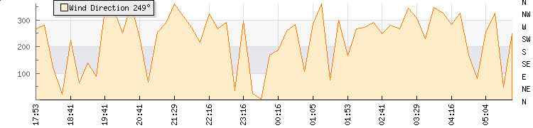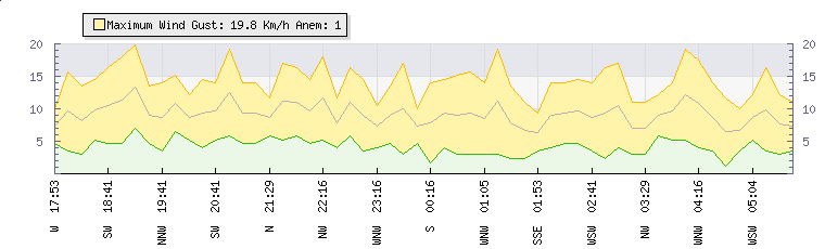 In the last few minutes the wind was West North West at an average speed of 11 kmh, reaching up to 18 kmh and a low of 4 kmh. The gust strength is14 kmh above the minimum speed |