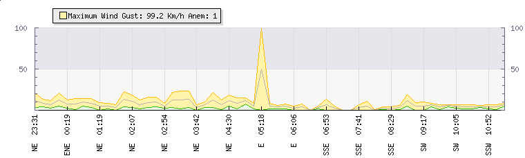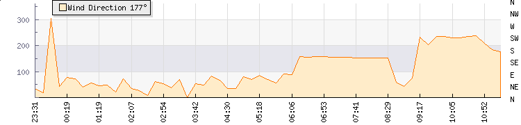 In the last few minutes the wind was South Westerly at an average speed of 6 kmh, reaching up to 7 kmh and a low of 4 kmh. The gust strength is3 kmh above the minimum speed |