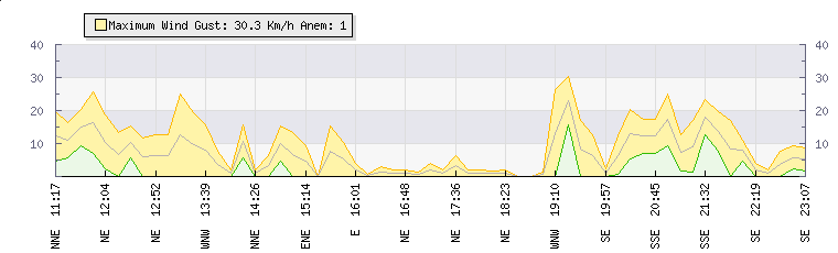 In the last few minutes the wind was North North East at an average speed of 1 kmh, reaching up to 2 kmh and a low of 0 kmh. The gust strength is2 kmh above the minimum speed |