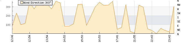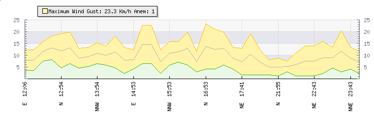 In the last few minutes the wind was West North West at an average speed of 6 kmh, reaching up to 11 kmh and a low of 1 kmh. The gust strength is10 kmh above the minimum speed |