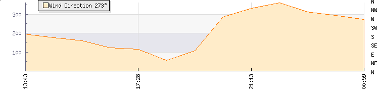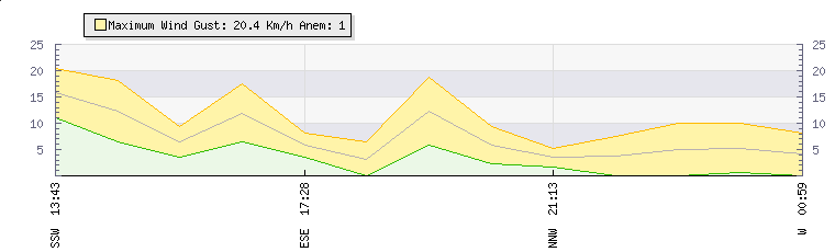 In the last few minutes the wind was North Westerly at an average speed of 5 kmh, reaching up to 10 kmh and a low of 0 kmh. The gust strength is10 kmh above the minimum speed |