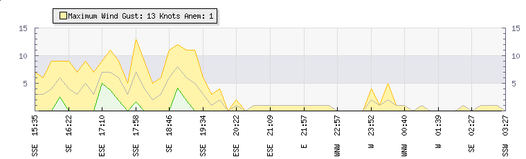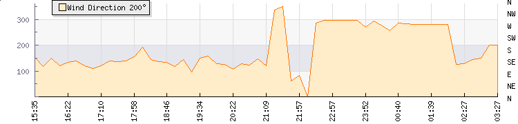 In the last few minutes the wind was Westerly at an average speed of 0 knots, reaching up to 0 knots and a low of 0 knots. The gust strength is0 knots above the minimum speed |