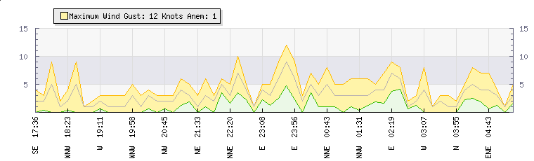In the last few minutes the wind was South Westerly at an average speed of 1 knots, reaching up to 3 knots and a low of 0 knots. The gust strength is3 knots above the minimum speed |