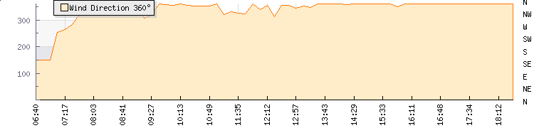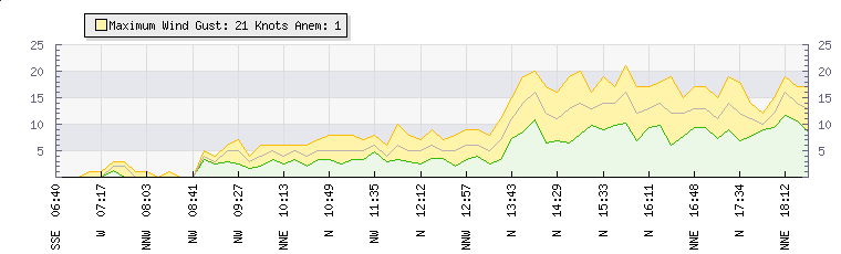 In the last few minutes the wind was North North East at an average speed of 13 knots, reaching up to 17 knots and a low of 9 knots. The gust strength is8 knots above the minimum speed |