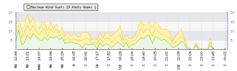 In the last few minutes the wind was Southerly at an average speed of 0 knots, reaching up to 0 knots and a low of 0 knots. The gust strength is0 knots above the minimum speed |