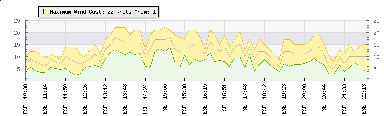 In the last few minutes the wind was East South East at an average speed of 6 knots, reaching up to 10 knots and a low of 3 knots. The gust strength is7 knots above the minimum speed |