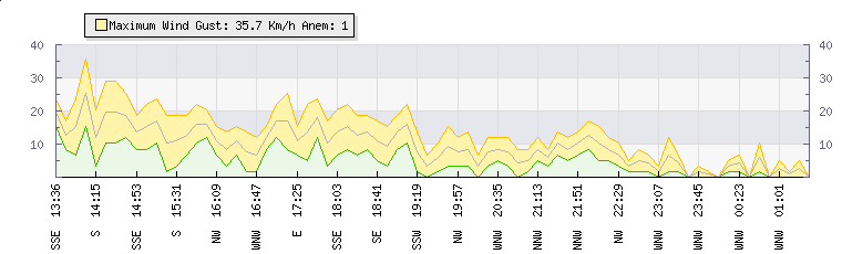 In the last few minutes the wind was South Easterly at an average speed of 17 kmh, reaching up to 27 kmh and a low of 7 kmh. The gust strength is20 kmh above the minimum speed |