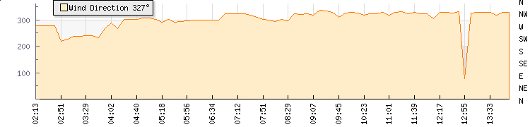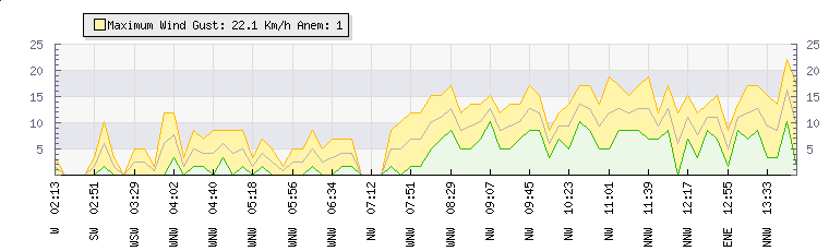 In the last few minutes the wind was West South West at an average speed of 3 kmh, reaching up to 7 kmh and a low of 0 kmh. The gust strength is7 kmh above the minimum speed |