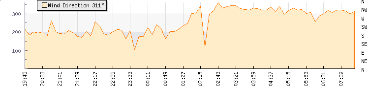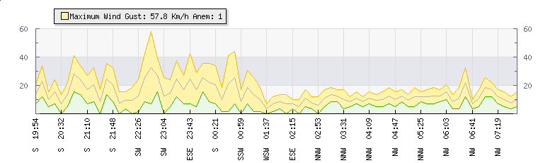In the last few minutes the wind was South Westerly at an average speed of 13 kmh, reaching up to 26 kmh and a low of 0 kmh. The gust strength is26 kmh above the minimum speed |