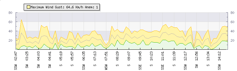 In the last few minutes the wind was Southerly at an average speed of 28 kmh, reaching up to 43 kmh and a low of 14 kmh. The gust strength is29 kmh above the minimum speed |