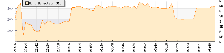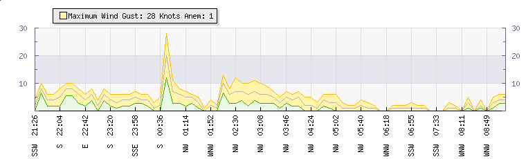 In the last few minutes the wind was North Westerly at an average speed of 1 knots, reaching up to 2 knots and a low of 0 knots. The gust strength is2 knots above the minimum speed |