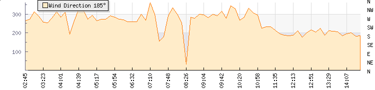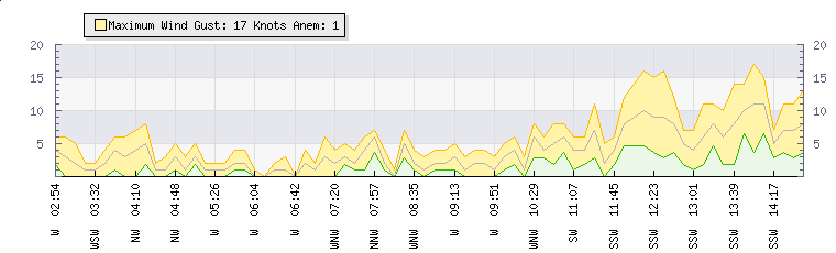 In the last few minutes the wind was South Westerly at an average speed of 6 knots, reaching up to 11 knots and a low of 2 knots. The gust strength is9 knots above the minimum speed |