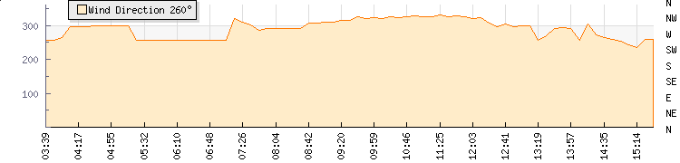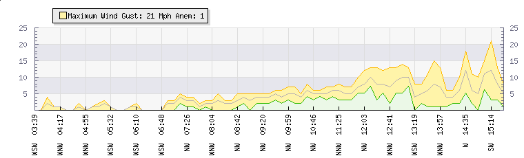 In the last few minutes the wind was Westerly at an average speed of 5 mph, reaching up to 8 mph and a low of 2 mph. The gust strength is6 mph above the minimum speed |