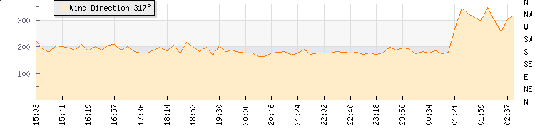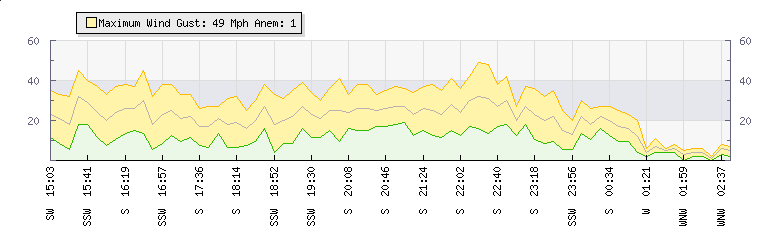 In the last few minutes the wind was Southerly at an average speed of 16 mph, reaching up to 23 mph and a low of 10 mph. The gust strength is13 mph above the minimum speed |