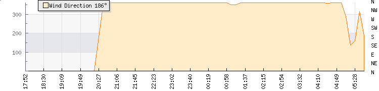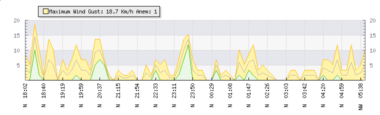 In the last few minutes the wind was Northerly at an average speed of 5 kmh, reaching up to 7 kmh and a low of 3 kmh. The gust strength is4 kmh above the minimum speed |