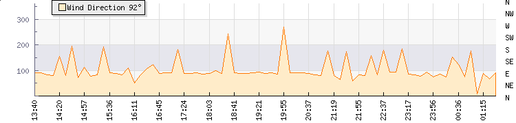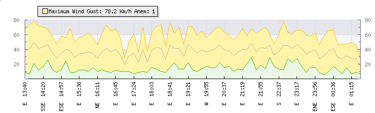 In the last few minutes the wind was South South East at an average speed of 38 kmh, reaching up to 66 kmh and a low of 10 kmh. The gust strength is56 kmh above the minimum speed |