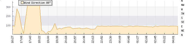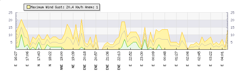 In the last few minutes the wind was Easterly at an average speed of 3 kmh, reaching up to 5 kmh and a low of 0 kmh. The gust strength is5 kmh above the minimum speed |