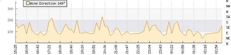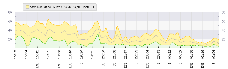 In the last few minutes the wind was Easterly at an average speed of 15 kmh, reaching up to 22 kmh and a low of 9 kmh. The gust strength is13 kmh above the minimum speed |