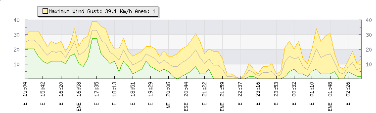 In the last few minutes the wind was Easterly at an average speed of 13 kmh, reaching up to 20 kmh and a low of 5 kmh. The gust strength is15 kmh above the minimum speed |
