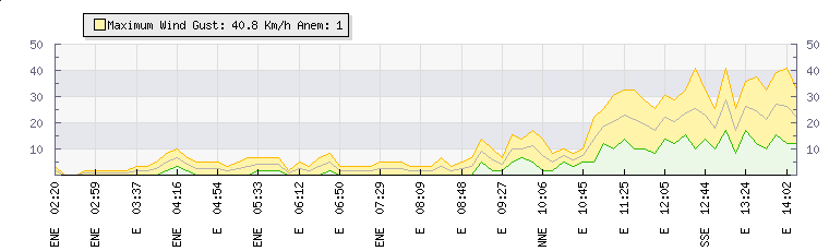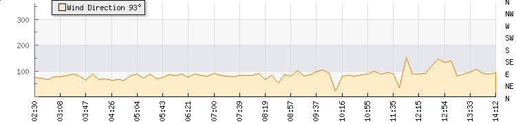 In the last few minutes the wind was South Easterly at an average speed of 18 kmh, reaching up to 26 kmh and a low of 10 kmh. The gust strength is16 kmh above the minimum speed |