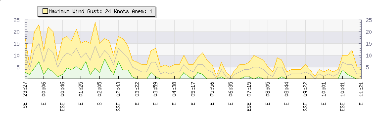 In the last few minutes the wind was South South East at an average speed of 3 knots, reaching up to 6 knots and a low of 0 knots. The gust strength is6 knots above the minimum speed |