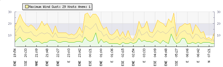 In the last few minutes the wind was Easterly at an average speed of 11 knots, reaching up to 17 knots and a low of 5 knots. The gust strength is12 knots above the minimum speed |