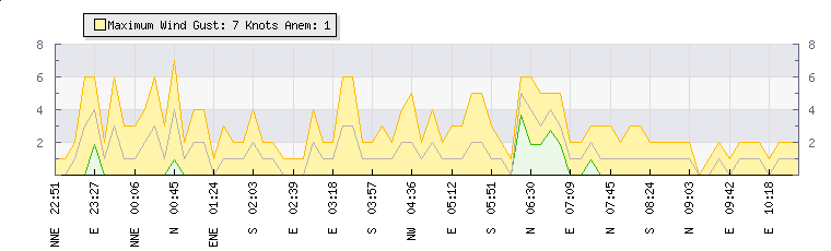 In the last few minutes the wind was Easterly at an average speed of 1 knots, reaching up to 2 knots and a low of 0 knots. The gust strength is2 knots above the minimum speed |