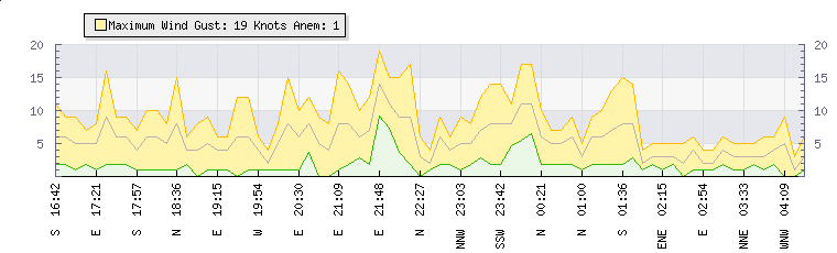 In the last few minutes the wind was Northerly at an average speed of 2 knots, reaching up to 4 knots and a low of 1 knots. The gust strength is3 knots above the minimum speed |