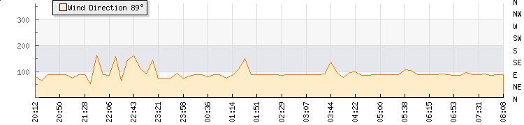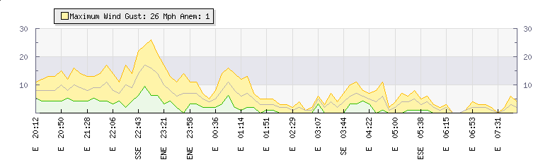 In the last few minutes the wind was East South East at an average speed of 3 mph, reaching up to 5 mph and a low of 1 mph. The gust strength is4 mph above the minimum speed |