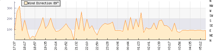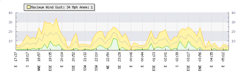 In the last few minutes the wind was Easterly at an average speed of 2 mph, reaching up to 4 mph and a low of 0 mph. The gust strength is4 mph above the minimum speed |
