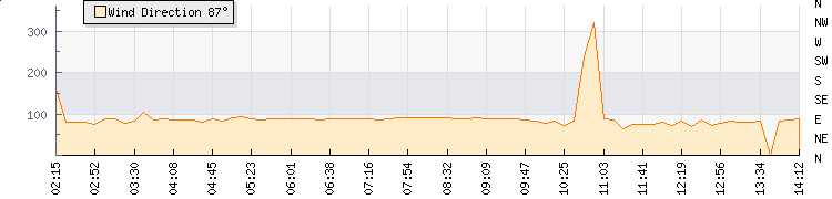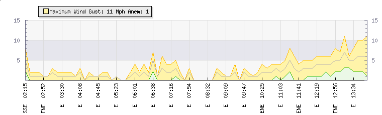 In the last few minutes the wind was East North East at an average speed of 3 mph, reaching up to 5 mph and a low of 1 mph. The gust strength is4 mph above the minimum speed |