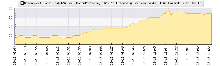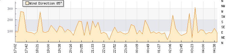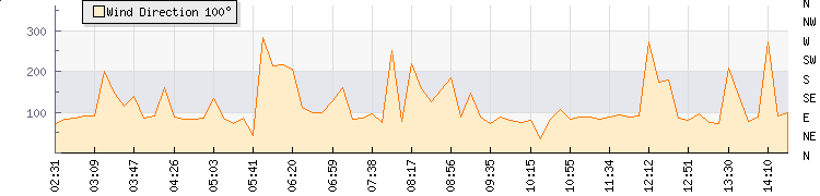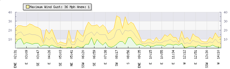 In the last few minutes the wind was Easterly at an average speed of 7 mph, reaching up to 13 mph and a low of 1 mph. The gust strength is12 mph above the minimum speed |
