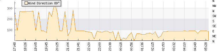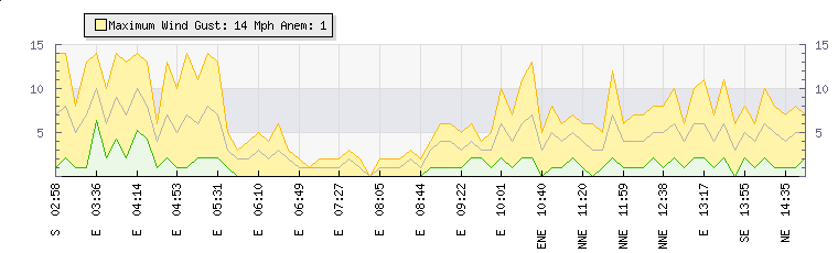 In the last few minutes the wind was Easterly at an average speed of 4 mph, reaching up to 7 mph and a low of 1 mph. The gust strength is6 mph above the minimum speed |