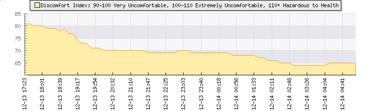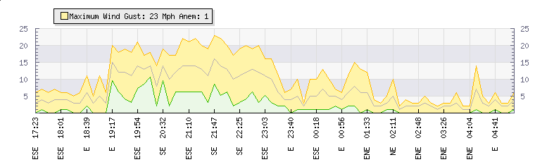 In the last few minutes the wind was East North East at an average speed of 6 mph, reaching up to 13 mph and a low of 0 mph. The gust strength is13 mph above the minimum speed |