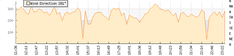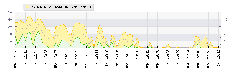 In the last few minutes the wind was West South West at an average speed of 8 kmh, reaching up to 17 kmh and a low of 0 kmh. The gust strength is17 kmh above the minimum speed |