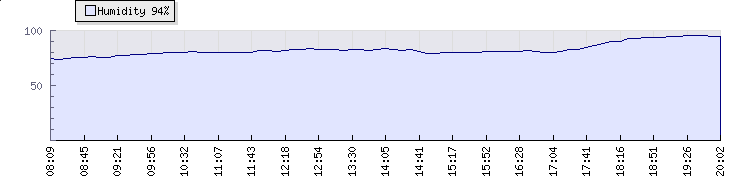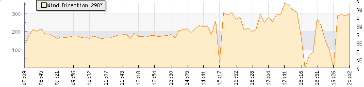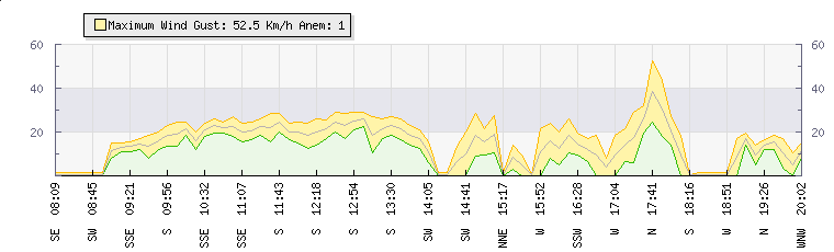 In the last few minutes the wind was Southerly at an average speed of 24 kmh, reaching up to 29 kmh and a low of 20 kmh. The gust strength is9 kmh above the minimum speed |