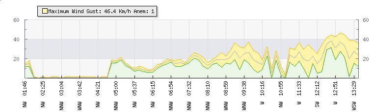In the last few minutes the wind was Westerly at an average speed of 22 kmh, reaching up to 30 kmh and a low of 15 kmh. The gust strength is15 kmh above the minimum speed |