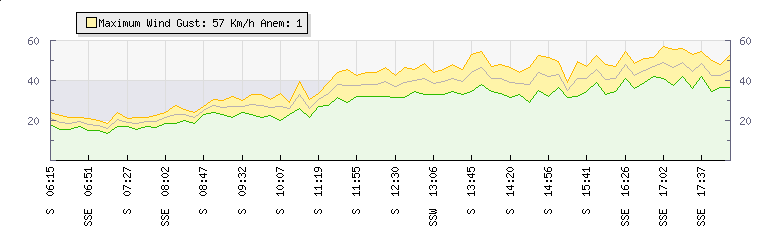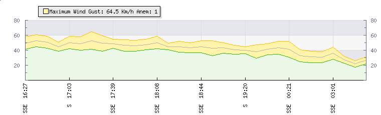 In the last few minutes the wind was Southerly at an average speed of 39 kmh, reaching up to 47 kmh and a low of 32 kmh. The gust strength is15 kmh above the minimum speed |