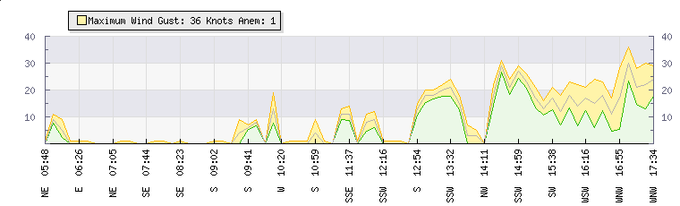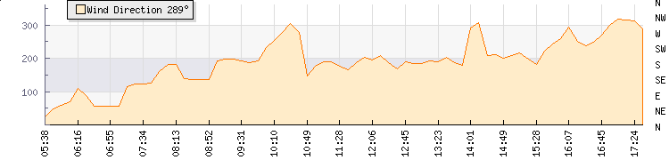 In the last few minutes the wind was West South West at an average speed of 15 knots, reaching up to 24 knots and a low of 6 knots. The gust strength is18 knots above the minimum speed |