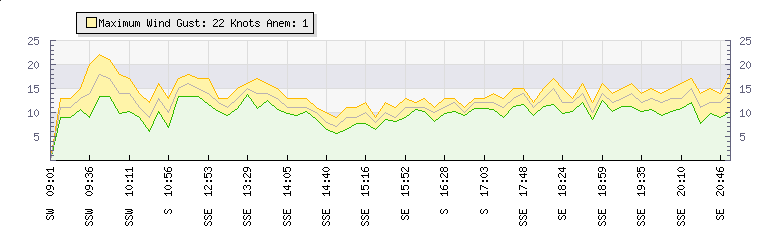 In the last few minutes the wind was South South East at an average speed of 14 knots, reaching up to 16 knots and a low of 12 knots. The gust strength is4 knots above the minimum speed |