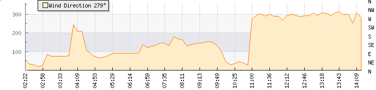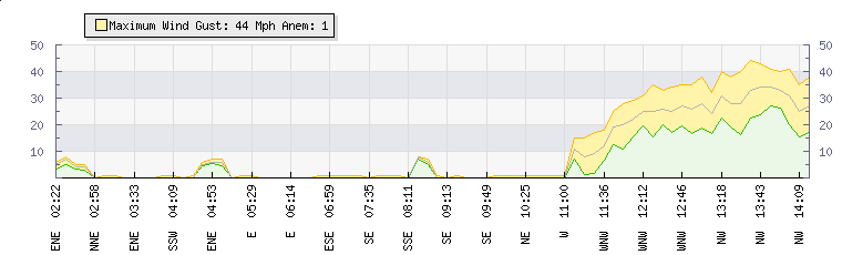 In the last few minutes the wind was West South West at an average speed of 31 mph, reaching up to 41 mph and a low of 20 mph. The gust strength is21 mph above the minimum speed |