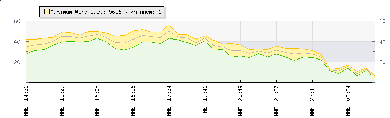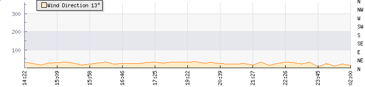 In the last few minutes the wind was North North East at an average speed of 8 kmh, reaching up to 11 kmh and a low of 6 kmh. The gust strength is5 kmh above the minimum speed |