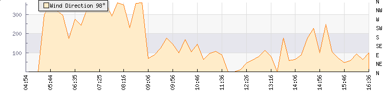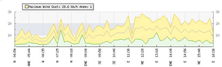 In the last few minutes the wind was South Easterly at an average speed of 21 kmh, reaching up to 35 kmh and a low of 7 kmh. The gust strength is28 kmh above the minimum speed |