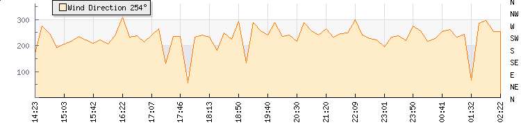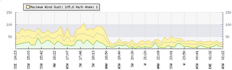 In the last few minutes the wind was South Westerly at an average speed of 19 kmh, reaching up to 28 kmh and a low of 11 kmh. The gust strength is17 kmh above the minimum speed |