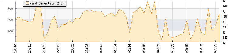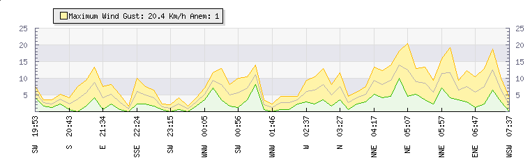 In the last few minutes the wind was North North East at an average speed of 11 kmh, reaching up to 16 kmh and a low of 7 kmh. The gust strength is9 kmh above the minimum speed |
